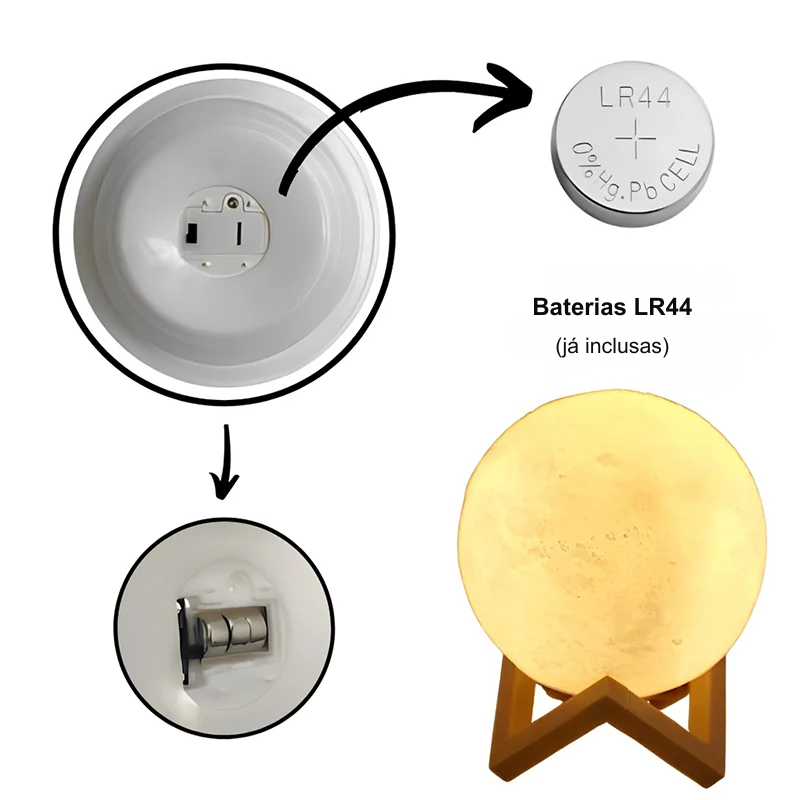 Funciona com baterias LR44 já inclusas, dispensando fios e facilitando o uso em qualquer lugar. Basta montar a base, inserir a lua e aproveitar.